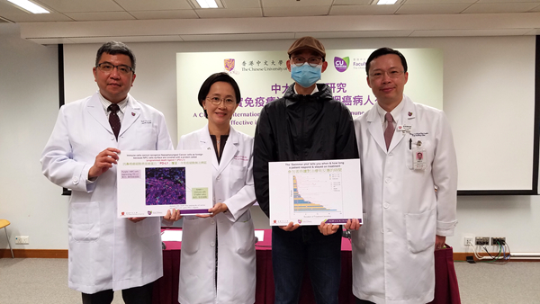 鼻咽癌是本港常見的十大癌症之一,在2014年本港有834宗新症,死亡率為28.4%。中大醫學院領導的國際研究於2015年至16年間,進行一項「免疫檢查點抑制劑」對復發性及擴散性鼻咽癌具治療研究,共招募了44位來自全球11個醫療中心的病人參與研究,當中大部分為亞洲人,其中11人是香港人。結果顯示,整體反應率20%,其中1名患者的癌症徵狀更完全消失持續近1年。而研究參與者在接受免疫治療后1年的整體存活率為60%,較以往同類患者接受其他治療的整體存率一般只有少於50%的成效較好。
