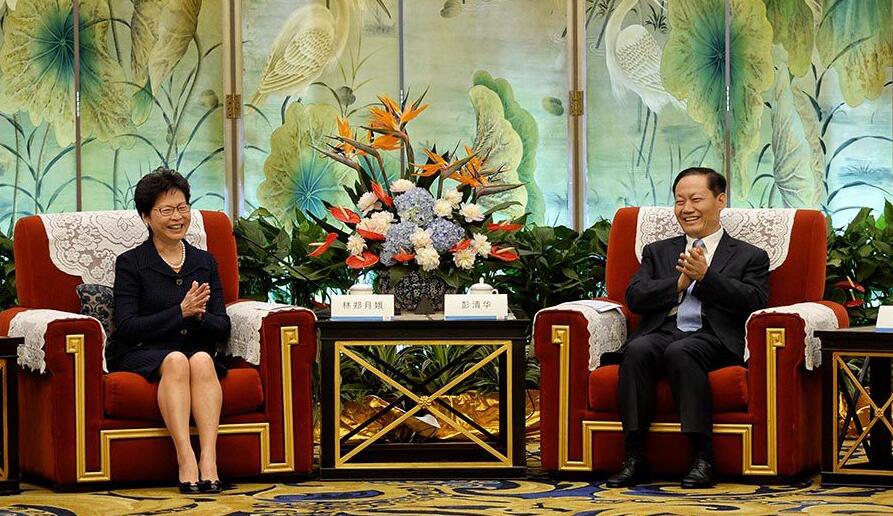 5月11日,成都,香港行政长官林郑月娥与四川省委书记彭清华共同出席川港合作第一次会议。国务院港澳办主任张晓明、香港中联办主任王志民出席会议。