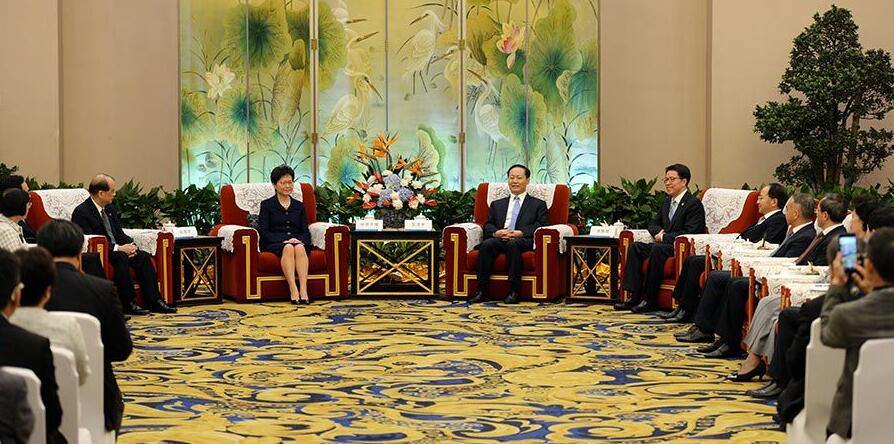香港特区代表团与四川省主要领导在世纪城国际会议中心三楼天府厅举行见面会。国务院港澳办主任张晓明、香港中联办主任王志民出席会议。