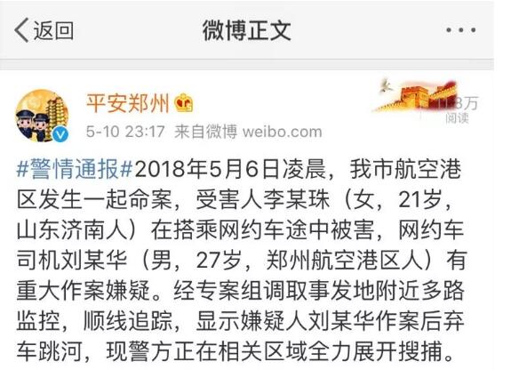 5月10日晚23:17,郑州市公安局官方微博@平安郑州发布警情通报:2018年5月6日凌晨,我市航空港区发生一起命案,受害人李某珠(女,21岁,山东济南人)在搭乘网约车途中被害,网约车司机刘某华(男,27岁,郑州航空港区人)有重大作案嫌疑。经专案组调取事发地附近多路监控,顺线追踪,显示嫌疑人刘某华作案后弃车跳河,现警方正在相关区域全力展开搜捕。