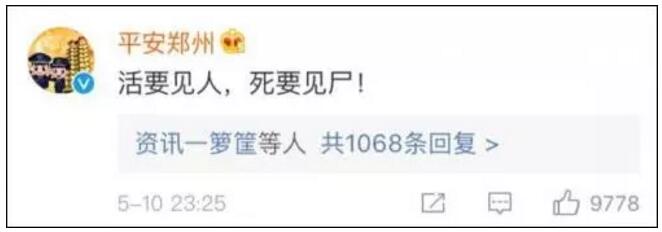 郑州警方还在回复中表示:“活要见人,死要见尸!”