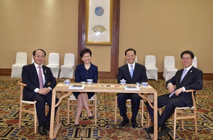 行政長官林鄭月娥(左二)昨日在成都出席川港高層會晤暨川港合作會議第一次會議并做开场发言。四川省委書記彭清華(右二)、港澳辦主任張曉明(右一)、中聯辦主任王志民(左一)出席会议。政府新闻处
