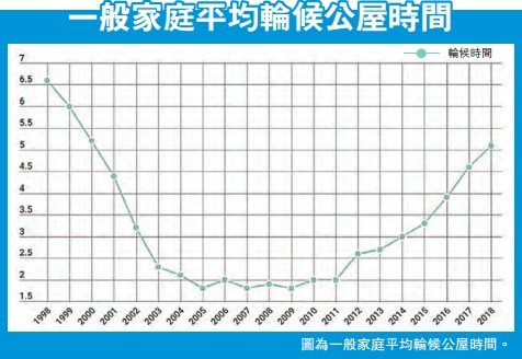 【香港商報网訊】記者戴合聲報道:房委會最新數字顯示,截至本年3月底,公屋輪候冊有逾27.2萬戶。一般申請的平均輪候時間創出5.1年新高。據房委會分析,於前年7月至去年6月期間,約2.2萬獲安置公屋的申請者中,有約1.1萬戶輪候5年以上,占總數約一半。有房委會委員認為當局應將公私營房屋比例從「六四比」調整至「七三比」;亦有委員預料公屋輪候時間有機會延長至6年。