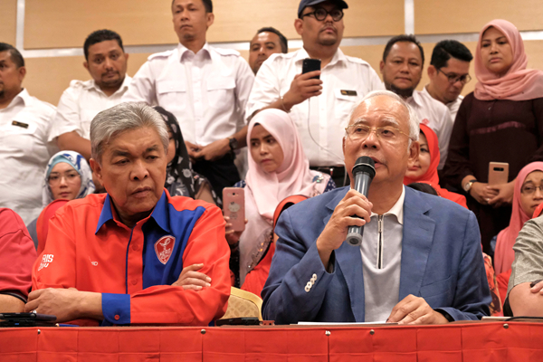 納吉布(右)昨天召開記者會,宣布即時辭去國陣與巫統的主席,並由副主席阿末扎希(左)接任。 路透社