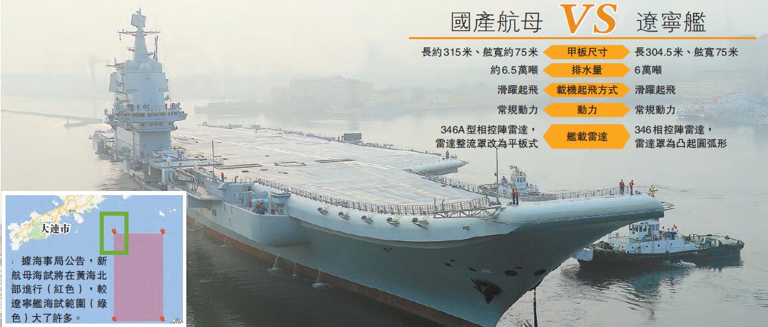 【香港商報网訊】13日上午7時許,首艘國產航母(001A)駛離碼頭開展海試,其自主研製的動力系統和推進系統將首次接受海洋環境的真正考驗,向成為一艘真正的作戰艦艇邁出關鍵一步。據了解,相比遼寧艦,首艘國產航母從設計到建造,全部由中國自主完成,並在遼寧艦使用的經驗基礎上進行了多項優化,性能將有全面提升。其研製和建造,標誌?中國已經掌握了建造中型航母,以及後續更大型航母的能力。
