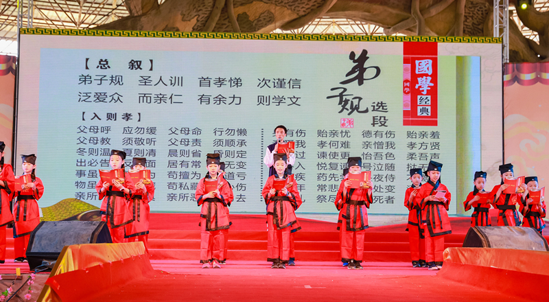 随后,全体青少年手捧一本传统书籍,在老师的带领下,诵读国学经典《弟子规》,谨遵“冠必正,纽必结,袜与履,俱紧切”的圣人训,父母为孩子们正衣冠,希望孩子能够注意形象礼节,正直做人。青少年的读书声,声声入耳,吸引台下众多游客围观,拍照记录,频频点赞。