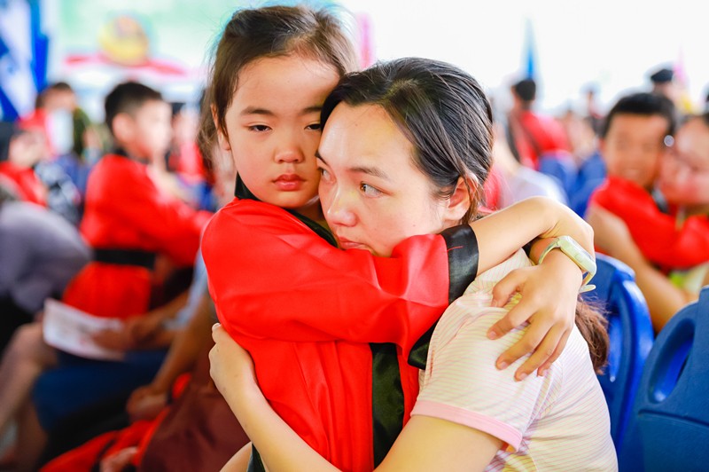 “自己的事情自己办,不给父母添麻烦”,全体青少年认真齐诵《孝敬父母歌》。在观看了一个关于母爱的感人视频之后,全体青少年面向父母行跪拜礼,答谢父母养育恩。孩子中有父母的乖宝宝,也有叛逆的少年,但在此刻,孩子们将对父母的感恩之情,化作一个个真诚的拥抱,一滴滴感恩的泪水。父母眼角含泪,与孩子紧紧相拥,场面十分感人。