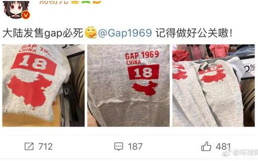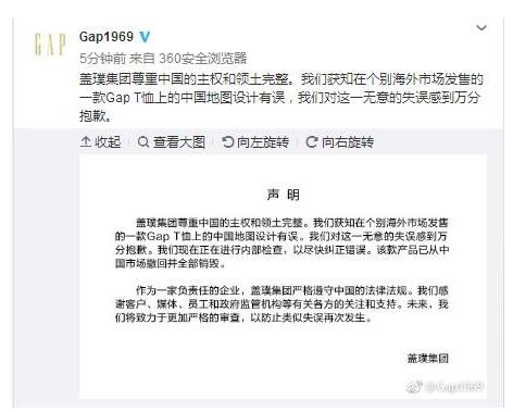 14日,有网友在微博晒出美国知名服装品牌GAP(盖璞)的一款T恤,T恤上的中国地图藏南、阿克赛钦、台湾、南海地区都被抹去。。。。。。环环中午致电Gap中国总部,对方客服表示中国目前未发售此款服装。晚间19点20分左右,盖璞官方微博就此事发出致歉声明称,“我们对这一无意的失误感到万分抱歉”,并称“该款产品已从中国市场撤回并全部销毁。”