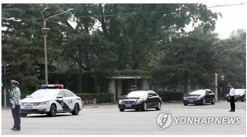 5月14日上午,朝鲜访华参观团乘坐的车队驶向钓鱼台国宾馆 韩联社 图