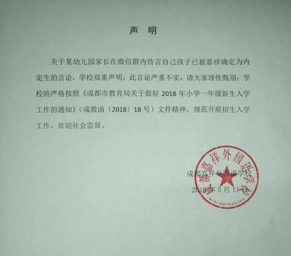 声明表示,“关于某幼儿园家长在微信群内传言自己孩子已被嘉祥确定为内定生的言论,学校郑重声明:此言论严重不实,请大家理性甄别;学校将严格按照《成都市教育局关于做好2018年小学一年级新生入学工作的通知》(成教函【2018】18号)文件精神,规范开展招生入选工作”。