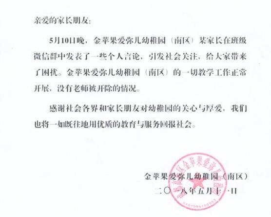 5月11日17时50分,成都金苹果国际幼儿教育机构微博@金苹果学前教育发布了情况说明:5月10日晚,金苹果爱弥儿幼稚园(南区)某家长在班级微信群中发布中发表了一些个人言论,引发社会关注,给大家带来了困扰。金苹果爱弥儿幼稚园(南区)的一切教学工作正常开展,没有老师被开除的情况。这份情况说明的署名为金苹果爱弥儿幼稚园(南区),印章为“成都高新区金苹果爱弥儿幼稚园”。