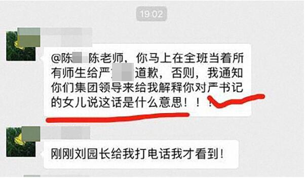 据澎湃新闻早前报道,5月11日前后微博上广泛流传的一组微信群聊截图显示,“陈某”在群内发言称,“以后严某某放学那会单独坐,或者周围的人给她清空,她单独坐一边,真的是够了。”不久后,群内署名为“严某某妈妈”的人士发言称,“陈老师,你马上在全班当着所有师生给严某某道歉,否则,我通知你们集团领导来给我解释你对严书记的女儿说这话是什么意思!”