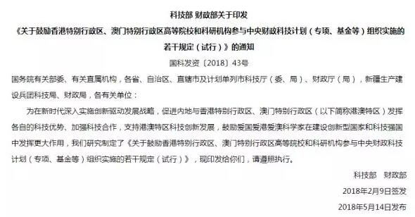 通知表示,为在新时代深入实施创新驱动发展战略,促进内地与香港特别行政区、澳门特别行政区(以下简称港澳特区)发挥各自的科技优势、加强科技合作,支持港澳特区科技创新发展,鼓励爱国爱港爱澳科学家在建设创新型国家和科技强国中发挥更大作用,我们研究制定了《关于鼓励香港特别行政区、澳门特别行政区高等院校和科研机构参与中央财政科技计划(专项、基金等)组织实施的若干规定(试行)》,现印发并请遵照执行(2018年2月9日签发,2018年5月14日发布。