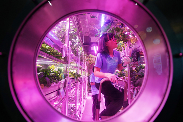 「月宮365」實驗,實現了「人-植物-動物-微生物」4生物鏈環人工閉合生態系統的長期穩定循環運轉。圖為艙內實驗人員收集蔬菜。 中新社