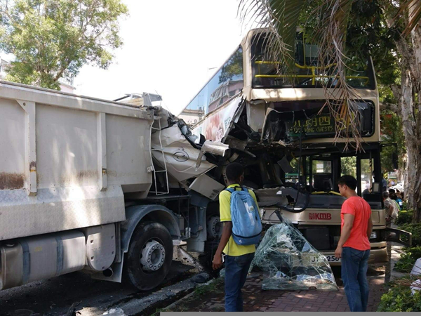 昨日下午1時44分,一名姓廖男司機(59歲)駕駛滿載泥石的重型泥頭車,沿八鄉錦田公路向大埔方向行駛,途至進橫台山附近時,泥頭車突然失控,越過對面線猛撼向一輛迎頭駛至54號線雙層九巴,泥頭車車頭嚴重損毀,司機重傷昏迷被困,九巴女車長浴血受傷,此時一批在附近等車的南亞裔人士,協助將女車長救出,另兩名非裔男乘客同告受傷。