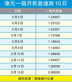 市場對美聯儲6月加息預期升溫,以及上市公司派息及招股活動等均再度抽緊市場流動性,未來1個月拆息有機會再度抽高。西太平洋銀行(Westpac)亞洲宏觀策略主管張淑嫻表示,假如一個月銀行同業拆息持續高於1厘水平,或成銀行上調最優惠利率的催化劑,相關情況最快有機會在聯儲局6月加息前發生。