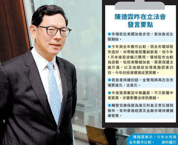 市場關注美聯儲今年加息步伐,陳德霖指,市場預計其年內將加息3至4次,惟隨經濟增長及失業率偏低,通脹可能進一步升溫。他稱現時市場仍然低估聯儲局的加息步伐,美加息或比預期快,因此或將增加金融市場波動。