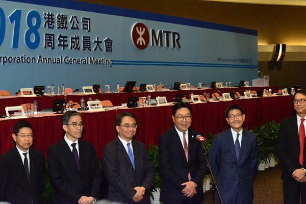港鐵主席馬時亨(右三)在港鐵周年股東大會上強調,市民最關心的票價機制,必須公平、公開及透明度高。記者馮俊文攝