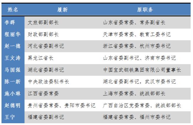 吴政隆(时任太原市委书记)调任江苏省委副书记、南京市委书记;之后,倪岳峰(时任福州市委书记)当选福建省委副书记;王蒙徽(时任沈阳市委书记)也当选辽宁省委副书记;陈一新空降湖北,任湖北省委副书记,武汉市委书记;王文涛(时任济南市委书记)任山东省委副书记。