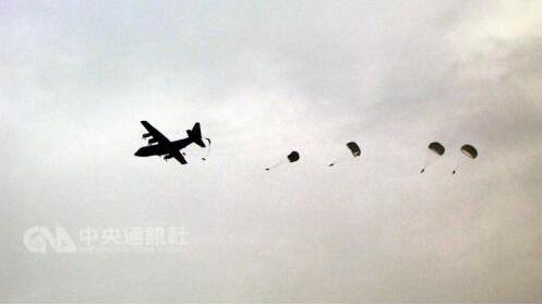 台军“汉光34号演习”预演5月17日上午发生意外,一名官兵实施空降跳伞时,疑因伞缠绕自空中坠地。来源:台湾“中央社”