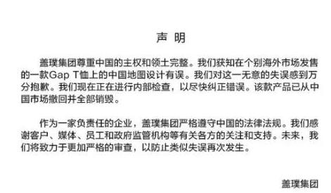 近日,有网友晒出美国服装品牌GAP的一款印有中国地图的T恤,T恤上的藏南、阿克赛钦、台湾、南海地区都被“抹去”。GAP当即发了道歉声明,尊重中国主权和领土完整,并宣布将相关产品下架销毁。