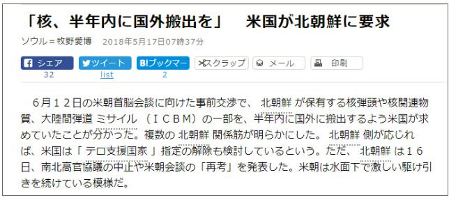 这无疑为定于下月12日的朝美首脑会谈平添变数。日本《朝日新闻》17日援引几位朝鲜消息人士表示,美国已经要求朝方在6个月内将部分核弹头、洲际弹道导弹及核物质运出朝鲜。