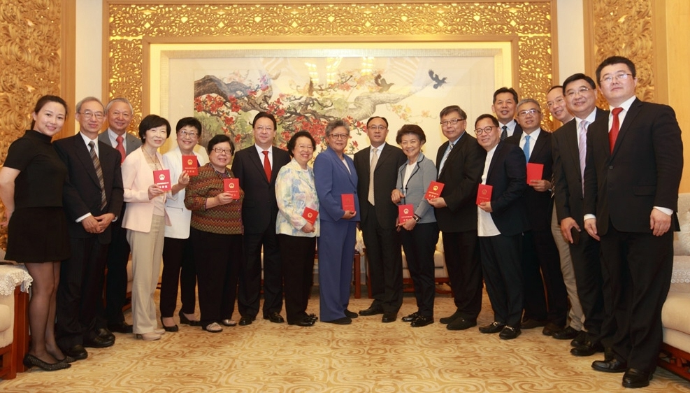 中联办副主任谭铁牛(左7)与全国人大常委会副秘书长郭振华(右9),向范徐丽泰(左9)等13位港区十二届全国人大代表颁发荣誉证书。