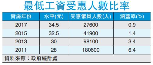 工聯會引述政府統計處《2017年收入及工時按年統計調查報告》的數據,指出全港只有約26700名打工仔賺取最低工資,只占全港受户人數不足1%,相較2011年實施時有180600名打工仔受惠,少了逾15萬人。受保障户員數目的比率大減逾5個百分點,推論工資增幅與勞動力市場已脫軌。