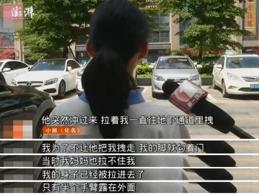据当事人小丽(化名)介绍,当时她为了不让自己被那名男子拽走,就用脚勾着门。“当时我妈妈也拉不住我,我的身子已经被拉进去了,只有半个手臂露在外面。”
