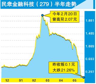 【香港商報網訊】記者吳天淇報道:民眾金融科技(279)早前擬引資民盛投資證券及期貨業務,但最終無法就有關投資達成協議,意向書失效。民眾金融科技股價繼續下跌,昨日一度低見0.098元,跌逾兩成,收市報0.1元,跌幅達21.26%。從2月中高位2.03元計數,股價跌近95%。另外,民眾持股8%的中國全通(633)昨插58%報0.72元。