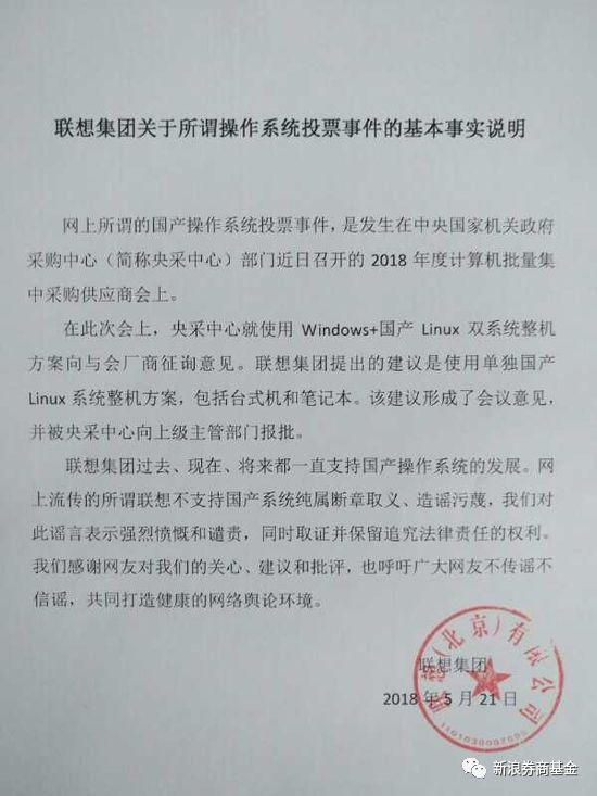 联想集团过去、现在、将来都一直支持国产操作系统的发展。网上流传的所谓联想不支持国产系统纯属断章取义、造谣污蔑,我们对此谣言表示强烈愤慨和谴责,同时取证并保留追究法律责任的权利。我们感谢网友对我们的关心、建议和批评,也呼吁广大网友不传谣不信谣,共同打造健康的网络舆论环境。
