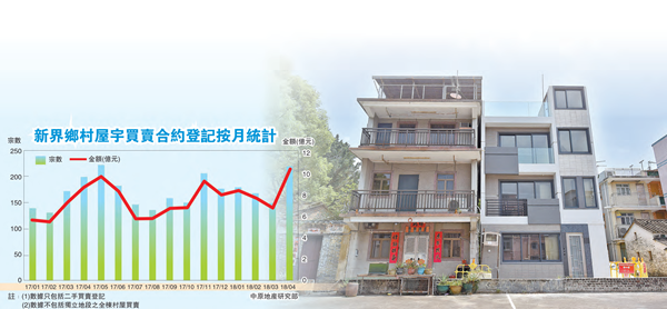 【香港商報网訊】記者曾浩榮報道:本港二手私人住宅樓價持續破頂,就連一直低水的新界樓市近期亦難覓尺價1萬元以下的放盤,促使部分購買力轉投村屋市場。中原地產研究部綜合土地註冊處最新資料顯示,4月份新界鄉村屋宇二手買賣合約登記(主要反映3月市况)錄219宗,涉資約10.28億元,創1997年8月后(11.27億元)近21年來的單月新高。