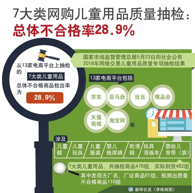 国家市场监督管理总局23日向社会公布2018年网络交易儿童用品质量专项抽检结果,从13家电商平台上抽检的7大类儿童用品,总体不合格商品检出率为28.9%。
