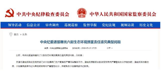 23日,中央纪委通报曝光了六起生态环境损害责任追究典型问题,包括天津津南区原副区长陈波、河北宁晋县副县长李风杰、江苏灌南县委书记李振中在内的55名领导干部被问责,受到了不同程度的处分甚至被免职。