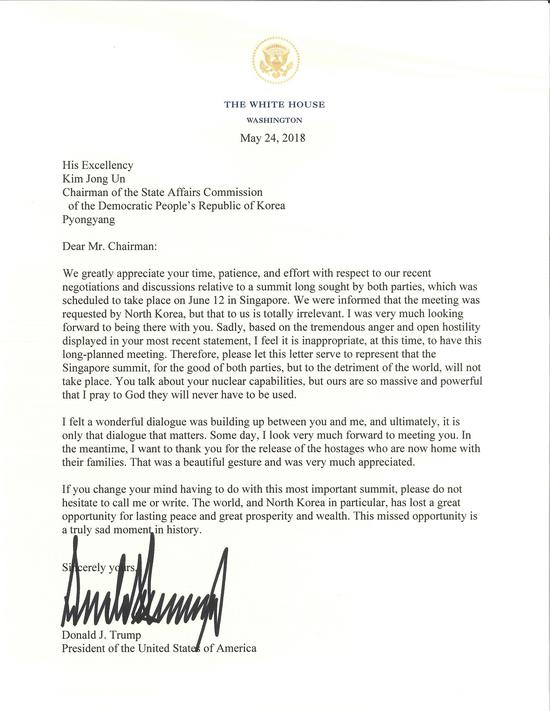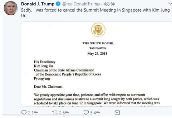 白宮聲明稱,特朗普已去信金正恩,決定取消原定下月12日兩人在新加坡舉行的首腦峰會。特朗普在信中指出,非常期待與金正恩會面,但由於金正恩近期的聲明展示出的巨大憤怒和公開敵意,令他感到遺憾,認為當前並不適合舉行會談。