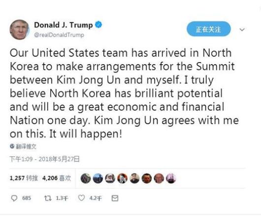 其后,特朗普也发布推特证实美国代表团于板门店与朝鲜方面会晤,特朗普称,“美国代表团已经抵达朝鲜, 为金正恩和我的首脑会议作出安排。”他表示,他真诚地相信朝鲜有辉煌的潜力(brilliant potential),有朝一日将成为一个经济繁荣、金融昌盛的国家(a great economic and financial Nation)。他称,金正恩也同意他的看法,这将成为现实。