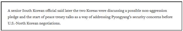 据路透社27日报道,韩国一位高级官员当天表示,朝美峰会前,韩朝两国正在商讨美国可能对朝鲜做出的一项互不侵犯(non-aggression)承诺,以及开始讨论和平协定,以消除朝鲜的安全顾虑。