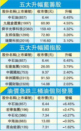 國際油價昨在亞洲市再挫近2%,中海油(883)盤中低見12.5元,最終收跌近1%報13元;中石化(386)一度跌至7.03元,尾市反彈收升0.27%報7.34元。中石油(857)則受惠天然氣價格上調上升6.4%報6.44元。
