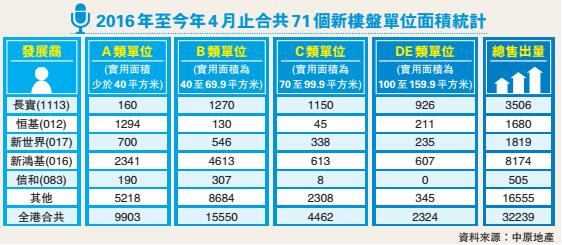不過,各地產商中,恒基地產(012)銷售A類單位比例最高,期內恒地共賣了1680個單位,當中A類面積最細的單位達1294間,佔銷售樓盤比例達77%。