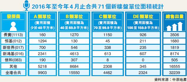 不過,各地產商中,恒基地產(012)銷售A類單位比例最高,期內恒地共賣了1680個單位,當中A類面積最細的單位達1294間,佔銷售樓盤比例達77%。
