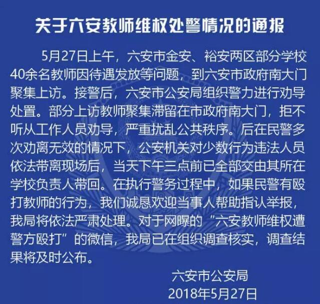 5月27日晚,六安市公安局官方微博发布《关于六安教师维权处警情况的通报》。通报称,六安市金安、裕安两区部分学校40余名教师因待遇发放等问题,到六安市政府南大门聚集上访。接警后,六安市公安局组织警力进行劝导处置。部分上访教师聚集滞留在市政府南大门,拒不听从工作人员劝导,严重扰乱公共秩序。后在民警多次劝离无效的情况下,公安机关对少数行为违法人员依法带离现场后,当天下午三点前已全部交由其所在学校负责人带回。