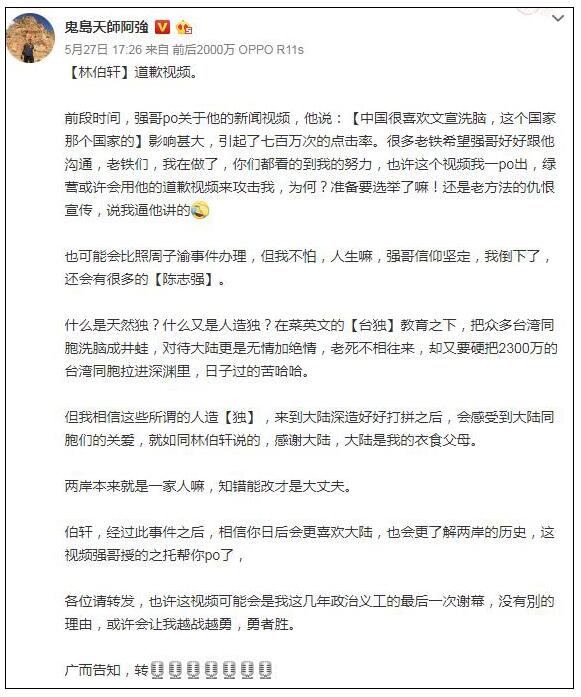 陈志强在微博贴出林伯轩道歉视频,并指出台湾同胞来大陆打拼后,会感受到大陆同胞们的关爱。(微博截图)