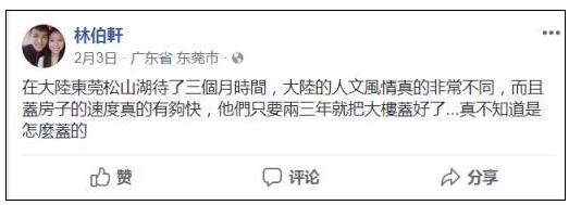 根据网民截图,林伯轩此前也在脸书感概大陆盖房子速度快。