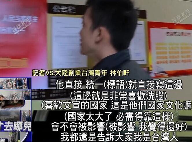 但在采访在大陆创业做电子竞技培训的台湾青年林伯轩时,TVBS记者看到背后墙上写着“依法治国有机统一”,却莫名地向他问道“‘统一’就直接写在这边?”