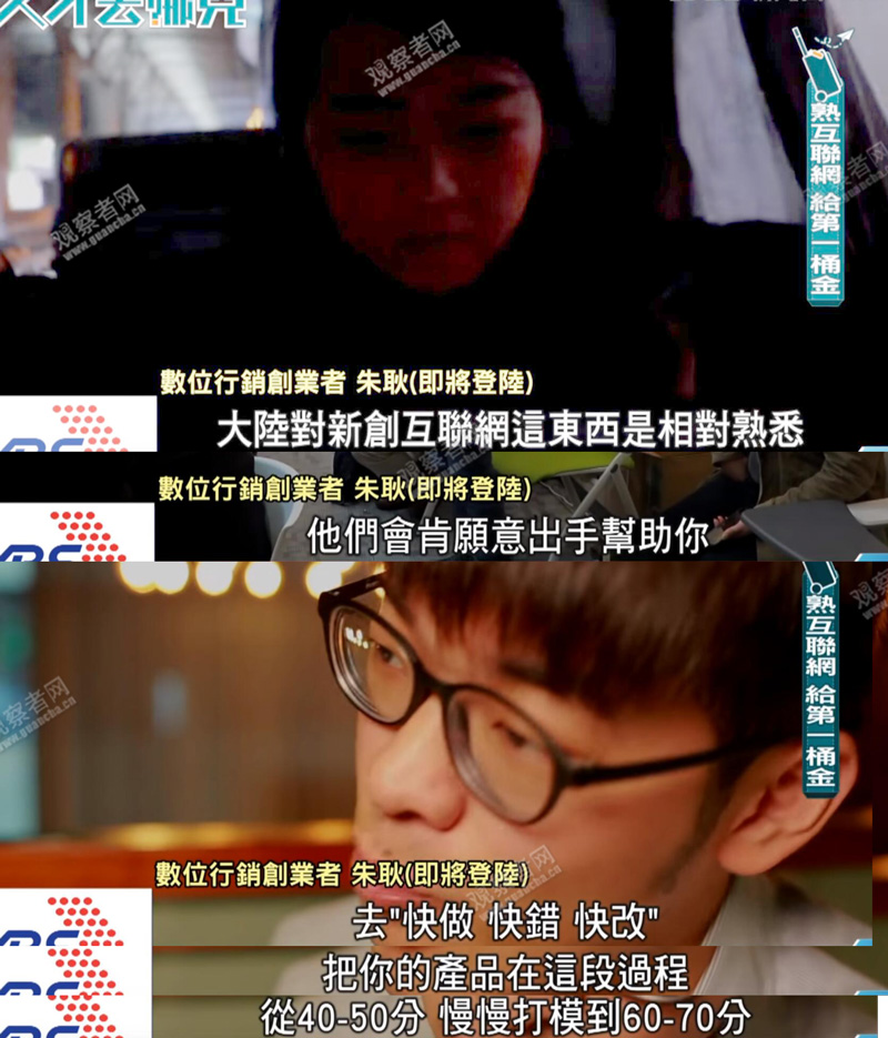 节目中,一位即将赴陆的数码营销创业者朱耿指出:“在台湾你可能会花很多时间才能把一个产品磨到90%,才有人来愿意投资你,这段时间有多久你不知道,而且你可能在这段时间就饿死了。”