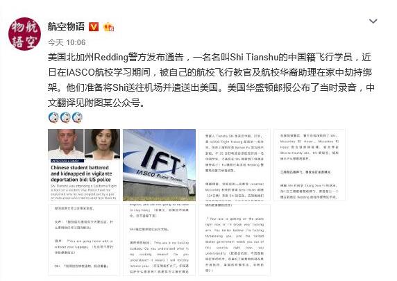 5月25日,美国北加州雷丁(redding)警方发布了一则通告称:一位名叫石田书(Tianshu Shi的音译)的中国籍飞行学员,在美国北加州雷丁IASCO航校学习期间,于25日被飞行教官及其华裔助理在家中绑架挟持,并将他送到机场准备遣送回中国。警方接到当事人哥哥的报警后赶到机场将人拦下。