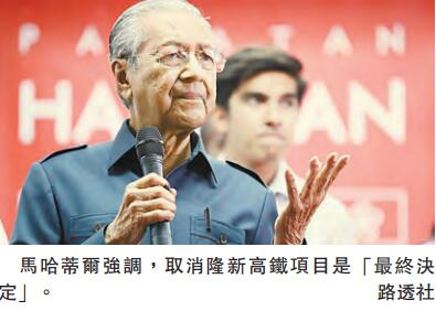 馬哈蒂爾在28日下午舉行的記者會上作出取消隆新高鐵項目的表態。他強調,取消高鐵項目是「最終決定」。馬哈蒂爾稱,該高鐵項目只是短程建設,整個車程只有一個小時。他認為,這個計劃對馬來西亞沒有好處,而馬方必須支付龐大的費用,但這計劃無法帶來報酬。