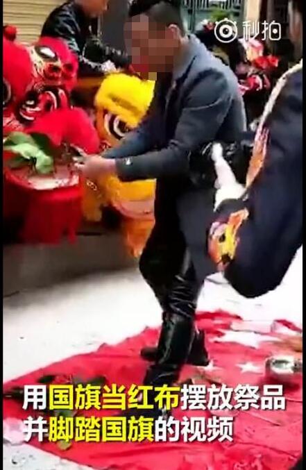2018年2月9日23时许,一段视频在微信朋友圈中转发传播,引起社会广泛关注。视频中,一名男子在舞狮表演过程用国旗当红布摆放祭品,并多次践踏国旗。