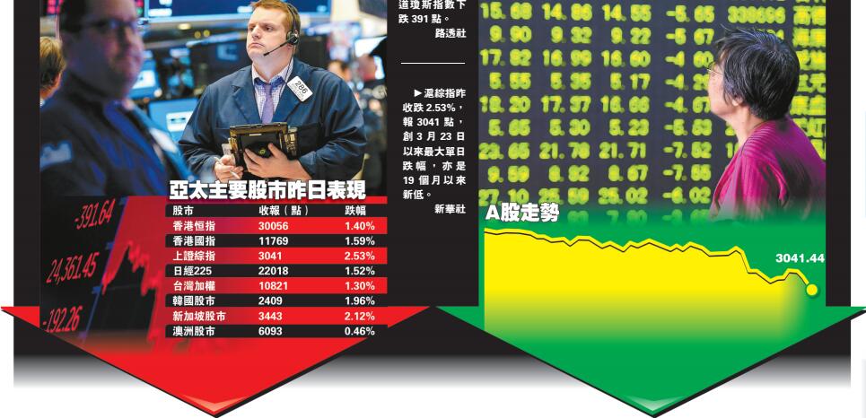 受中美貿易陰雲密布影響,加之意大利局勢動蕩、美6月加息在即,亞太股市主要股指回落明顯,跌幅介乎1%至3%。其中,亞洲股市顯著走低,日韓股市跌幅介乎1%至2%;澳洲股市跌0.46%。滬深股市下跌均超2%,上證綜指收跌79點或2.53%,報3041點,日益迫近3000點,創下3月23日以來最大單日跌幅,亦是19個月以來的新低。