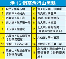 漁農自然護理署在「郊野樂行」網站上載有關郊野公園曾發生致命及嚴重意外的高危地點資料外,現時網站共列出16個黑點,包括馬鞍山吊手岩、飛鵝山自殺崖、南大嶼狗牙嶺、西貢蚺蛇尖等,各郊野公園亦會豎立警告牌,提醒遠足人士切勿前往。